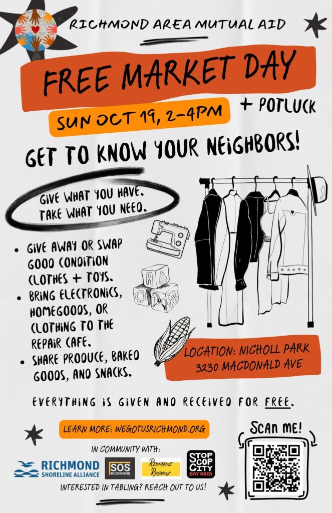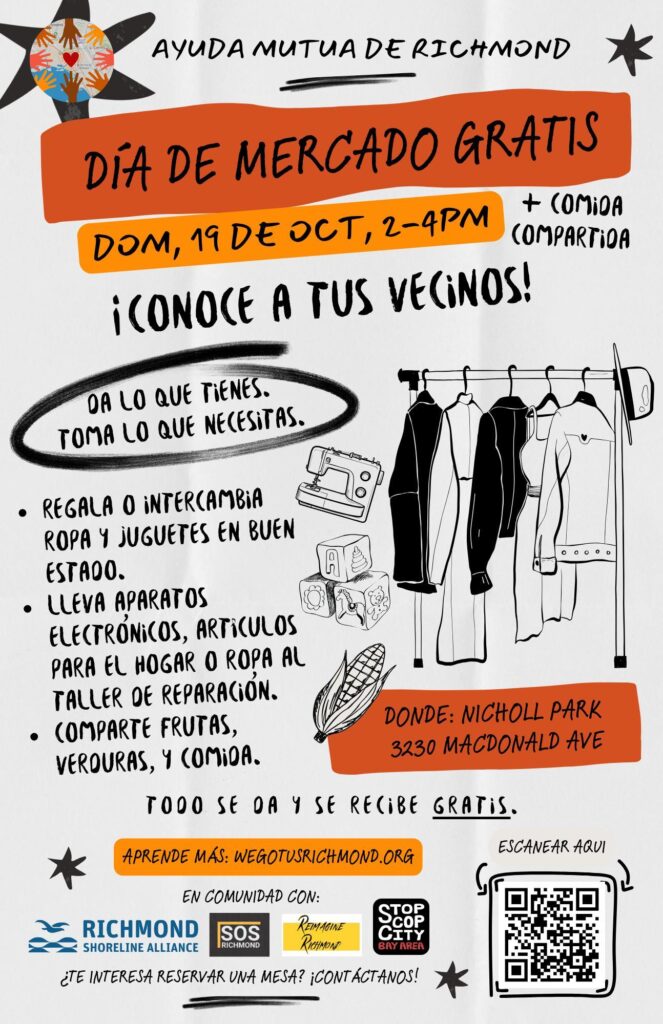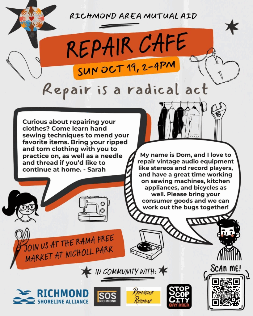 Únete a nosotros para compartir comida, conocer a tus vecinos, intercambiar ropa, juguetes y otras cosas. Trae ropa o aparatos eléctricos al café de reparación.